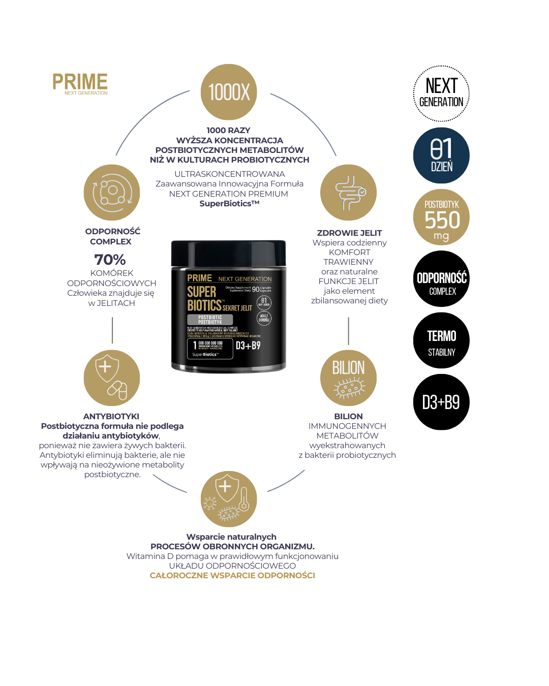 PRZEŁOMOWE, ZAAWANSOWANE, MOCNE wsparcie POSTBIOTYCZNE, wzbogacone o składniki, które wspierają prawidłowe funkcjonowanie UKŁADU ODPORNOŚCIOWEGO (witamina D, kwas foliowy) oraz prawidłowe funkcjonowanie JELIT jako element zbilansowanej diety.